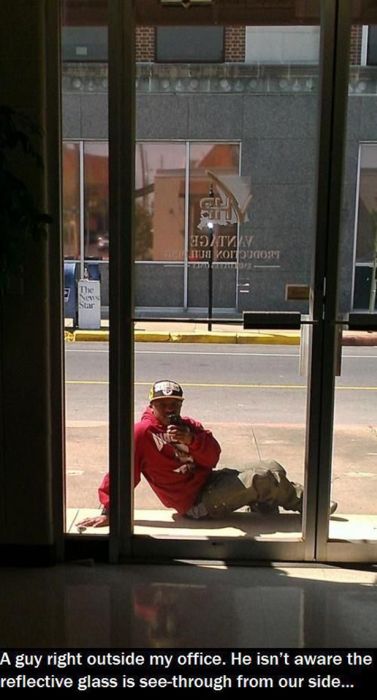 האדם שישב על המדרכה והחל לצלם את עצמו על המראה מבלי לדעת שזו מראה חד צדדית